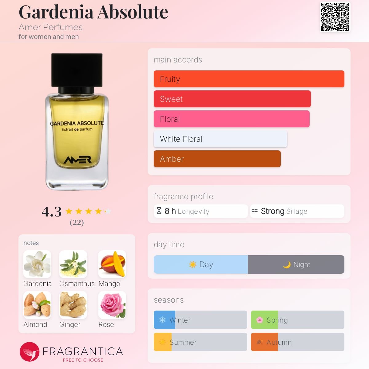 Gardenia Absolute by Amer Perfumes is a Oriental Floral fragrance for women and men. Gardenia Absolute was launched in 2023. The nose behind this fragrance is Amer Alradhi. Top notes are Bitter Almond, Ginger and Bergamot; middle notes are Gardenia, Osmanthus, Mango, Rose, Ginger and Ylang Ylang; base notes are Musk, White Amber, Mysore Sandalwood, White Oud, Tonka Bean and Vanilla.