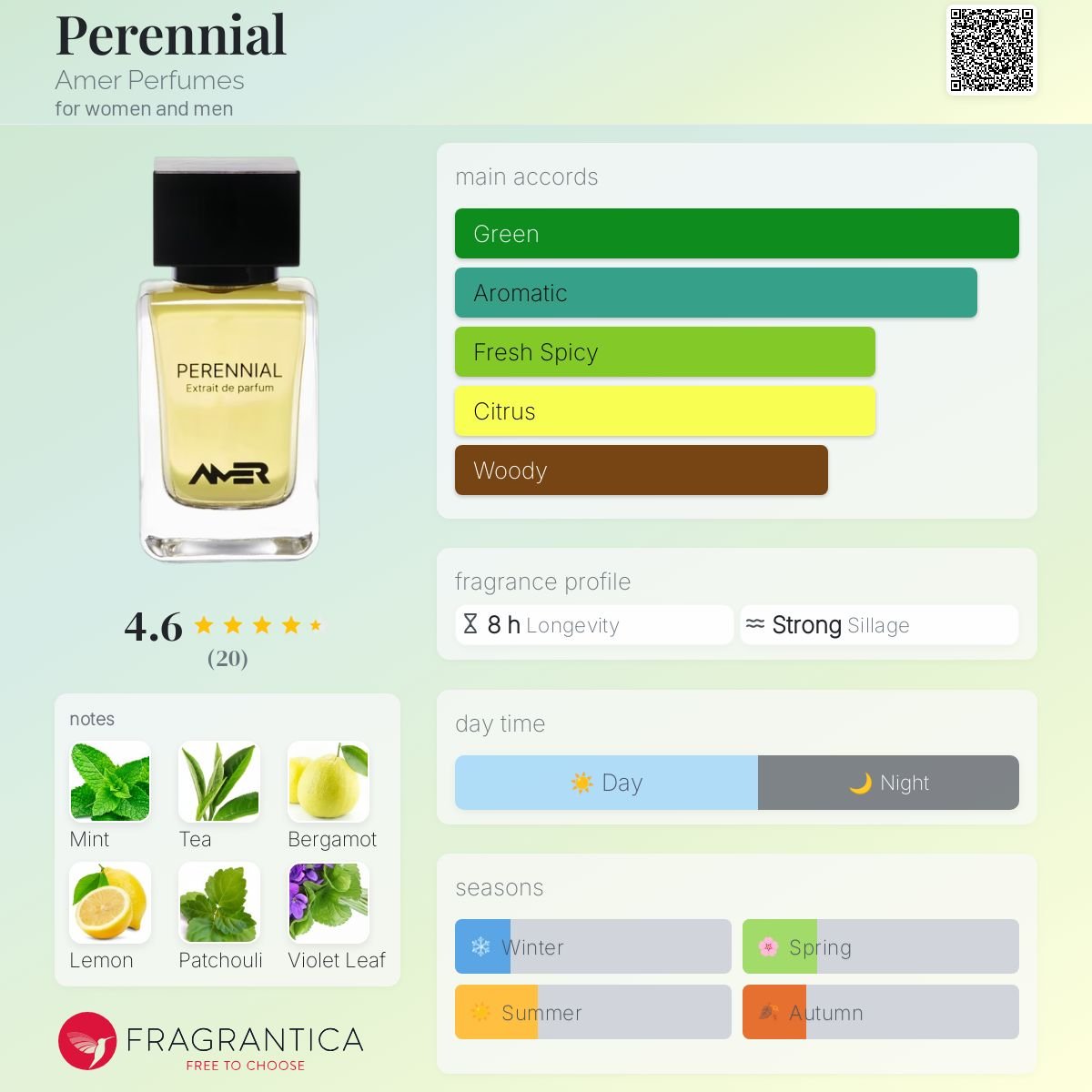 Perennial by Amer Perfumes is a Floral Green fragrance for women and men. This is a new fragrance. Perennial was launched in 2024. The nose behind this fragrance is Amer Alradhi. Top notes are Mint, Bergamot, Lemon, Coriander, Olibanum and Ginger; middle notes are Mint, Green Tea, Violet Leaf, Jasmine, Gardenia, Cardamom and Galbanum; base notes are Patchouli, Vetiver, Sandalwood, Ambergris, Leather, Tobacco and Musk.
