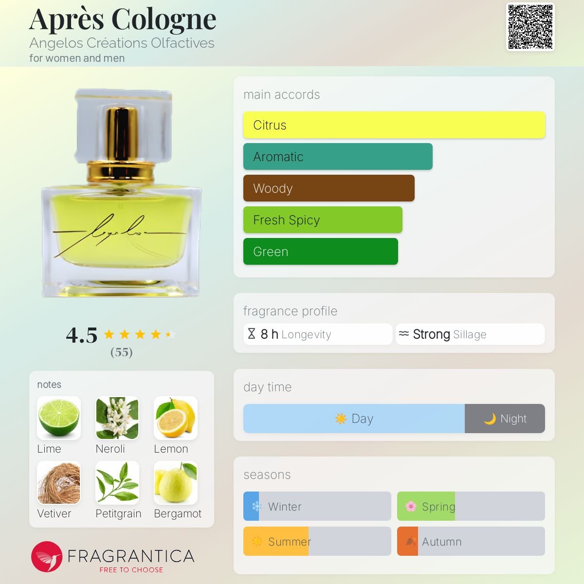 Après Cologne by Angelos Créations Olfactives is a fragrance for women and men. Après Cologne was launched in 2019. The nose behind this fragrance is Angelos Balamis. Top notes are Lime, Lemon, Bergamot, Blood Orange, Blood Mandarin, Pink Grapefruit and Sweet Orange; middle notes are Neroli, Petitgrain, Orris and Crithmum; base notes are Java vetiver oil, Musk, Tea Tree Oil, Australian Sandalwood and Labdanum.
