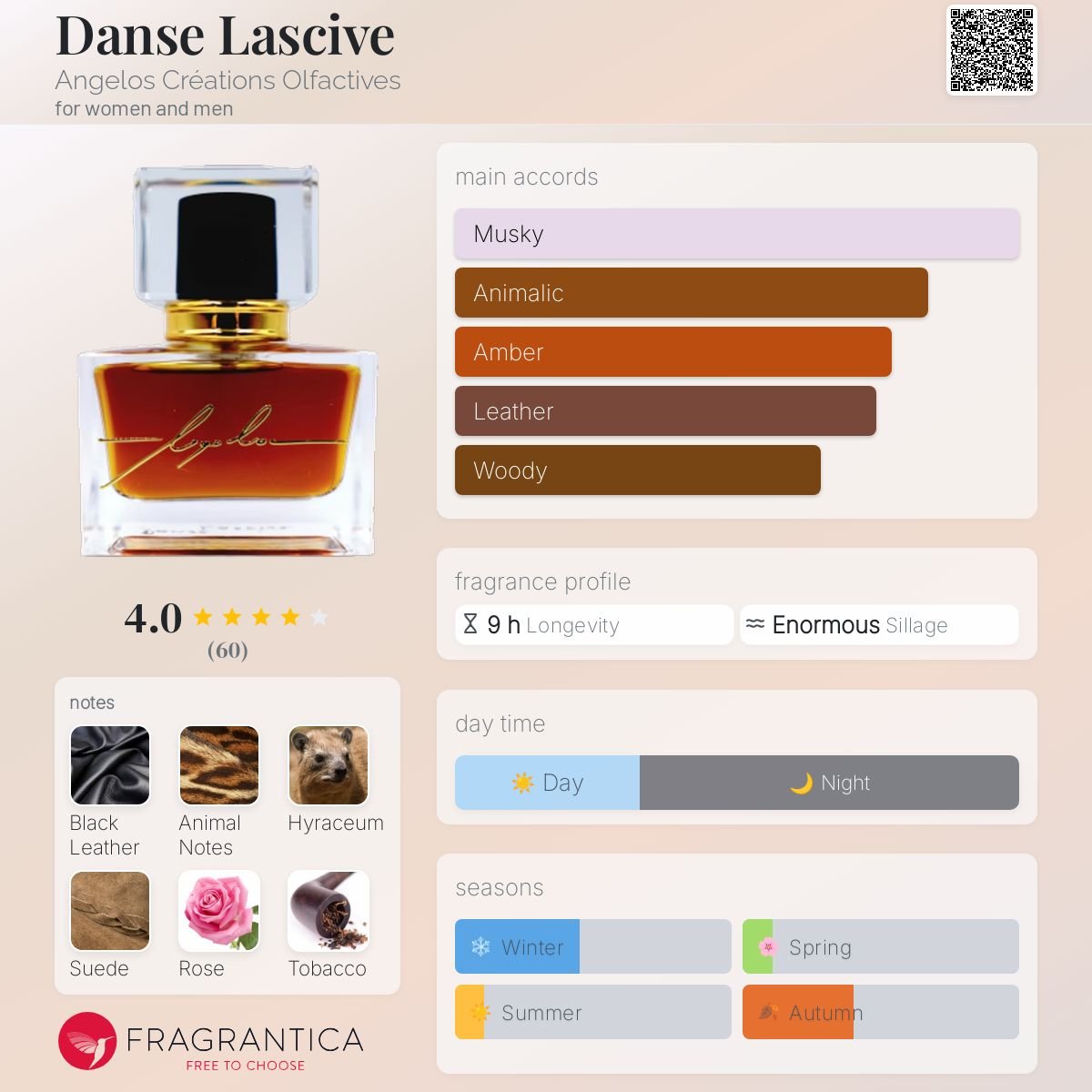 Danse Lascive by Angelos Créations Olfactives is a fragrance for women and men. Danse Lascive was launched in 2023. The nose behind this fragrance is Angelos Balamis. Top notes are Black Rose, Bulgarian Rose, Birch, Saffron and Bourbon Geranium; middle notes are Black Leather, Animal notes, Suede, Turkish Rose and Tobacco; base notes are Hyrax, Olibanum, Civet, Java vetiver oil, Labdanum, Oakmoss and Atlas Cedar.
