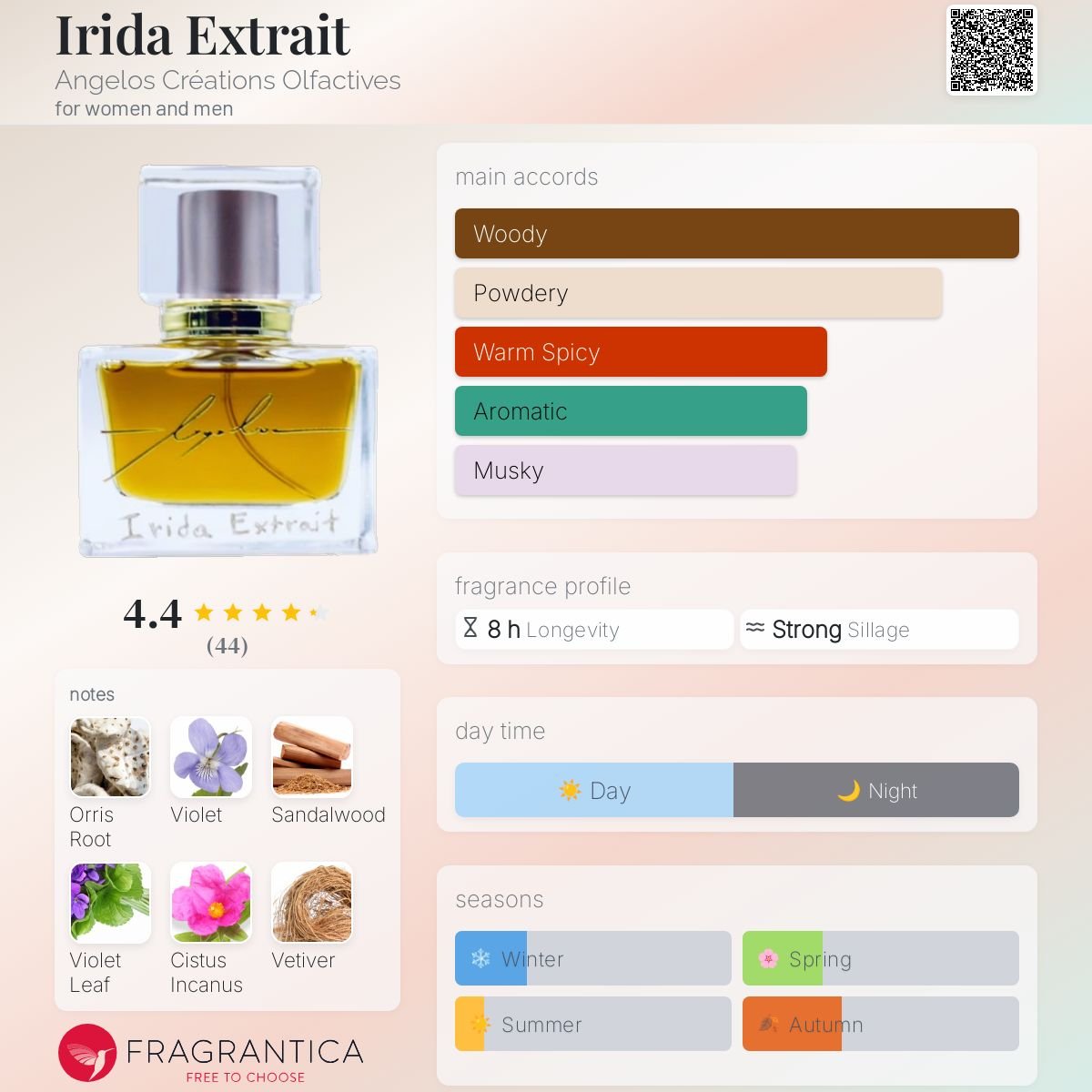 Irida Extrait by Angelos Créations Olfactives is a fragrance for women and men. Irida Extrait was launched in 2023. The nose behind this fragrance is Angelos Balamis. Top notes are Violet Leaf and Tunisian Neroli; middle notes are Orris, Violet, Carrot Seeds, Cinnamon, Clove and Jasmine; base notes are Sandalwood, Cistus Incanus, Haitian Vetiver, Guaiac Wood, Labdanum, Ambrette and Amyris.
