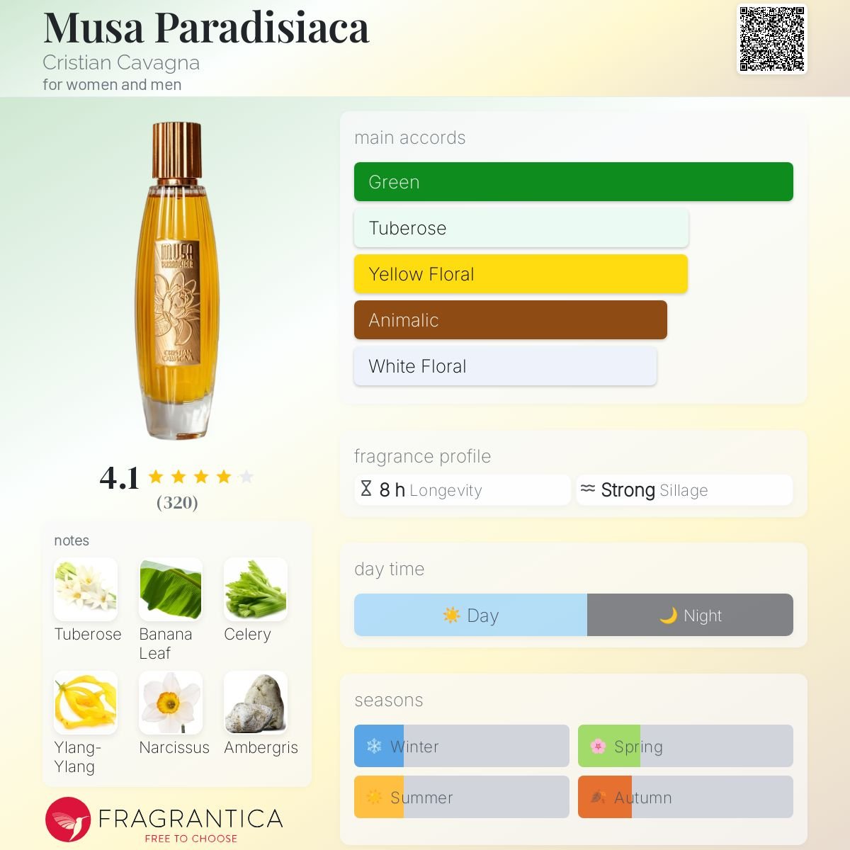 Musa Paradisiaca by Cristian Cavagna is a Floral Fruity fragrance for women and men. Musa Paradisiaca was launched in 2021. Musa Paradisiaca was created by Arturetto Landi and Cristian Cavagna. Top notes are Tuberose, Banana Leaf, Celery and Ginger; middle notes are Tuberose, Ylang-Ylang and Narcissus; base notes are Tuberose, Ambergris, Sandalwood, Civet, Vanilla Absolute, Tonka Bean and Cacao.