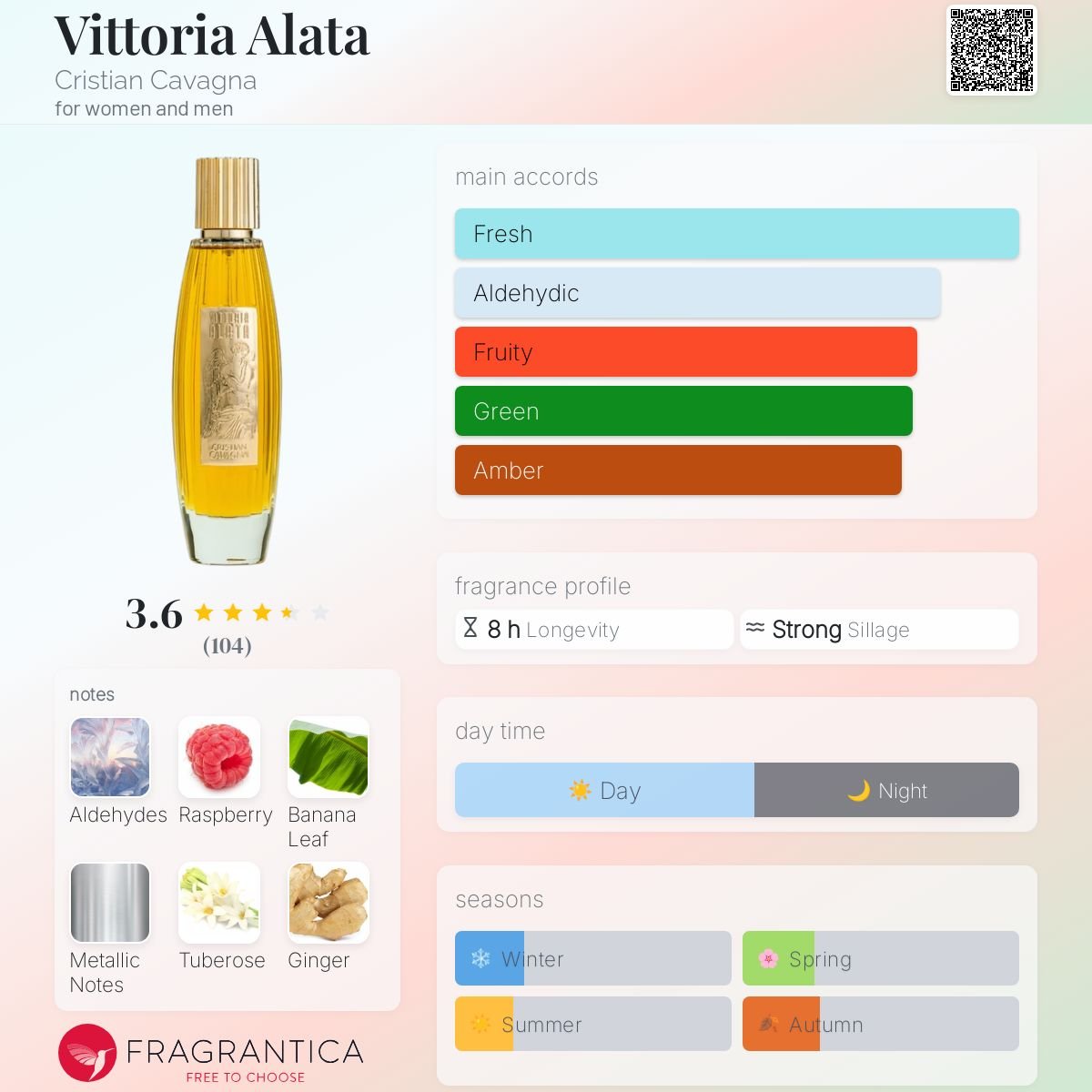 Vittoria Alata by Cristian Cavagna is a fragrance for women and men. Vittoria Alata was launched in 2023. Vittoria Alata was created by Arturetto Landi and Cristian Cavagna. Top notes are Aldehydes, Banana Leaf and Ginger; middle notes are Raspberry, Metallic notes, Tuberose and Iris; base notes are Frankincense, Musk, Amber and Vanilla.