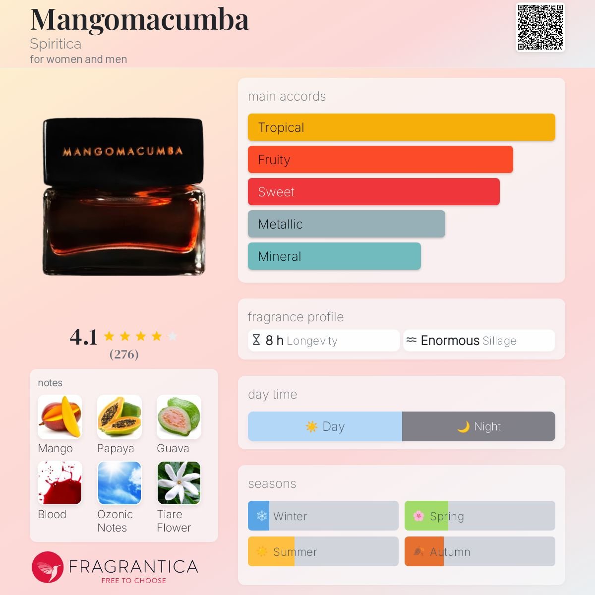 Mangomacumba by Spiritica is a fragrance for women and men. This is a new fragrance. Mangomacumba was launched in 2024. Mangomacumba was created by Daniele Muratori Caputo and Daniele Cerroni. Top notes are Mango, Papaya, Ozonic notes, Lime, Mint and Pineapple; middle notes are Mango, Papaya, Guava, Blood, Tiare Flower and Metallic notes; base notes are Animal notes, Ebony, Milk, Earthy Notes, Clay, White Musk and Tobacco.