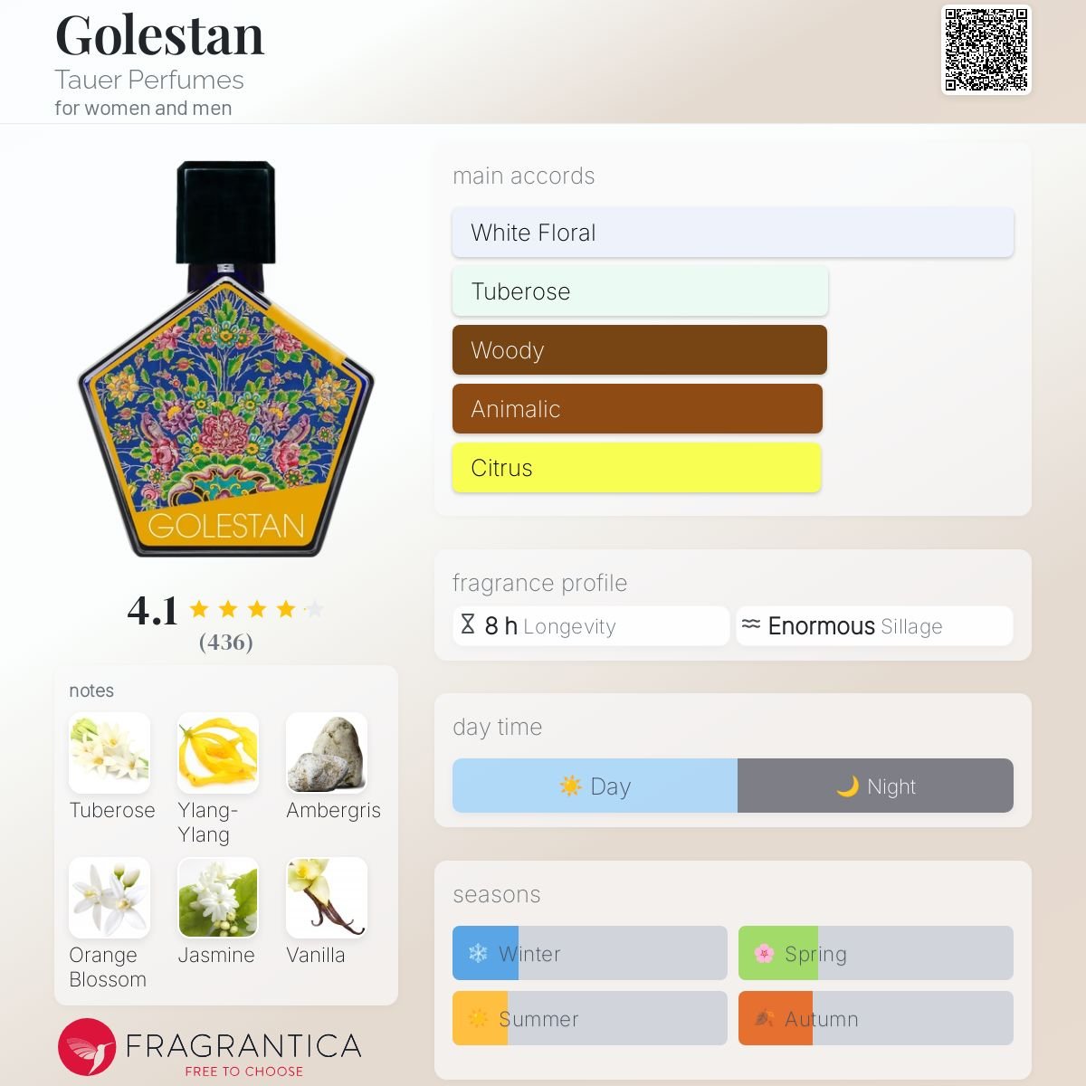 Golestan by Tauer Perfumes is a Oriental Floral fragrance for women and men. Golestan was launched in 2022. The nose behind this fragrance is Andy Tauer. Top notes are Ylang-Ylang, Lemon Zest and Bergamot; middle notes are Tuberose, Orange Blossom, Jasmine and Damask Rose; base notes are Ambergris, Vanilla, Woody Notes, Patchouli and Cistus Incanus.