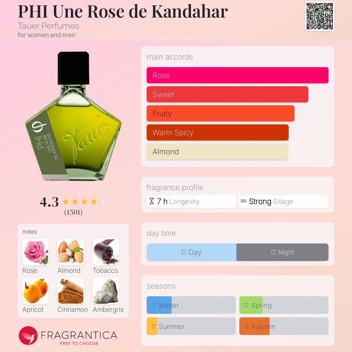PHI Une Rose de Kandahar by Tauer Perfumes is a Floral fragrance for women and men. PHI Une Rose de Kandahar was launched in 2013. The nose behind this fragrance is Andy Tauer. Top notes are Almond, Apricot, Cinnamon and Bergamot; middle notes are Rose, Tobacco Leaf and Geranium; base notes are Ambergris, Patchouli, Vanilla, Tonka Bean, Musk and Vetiver.